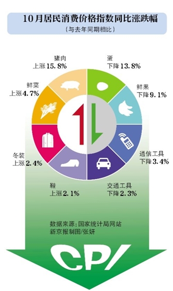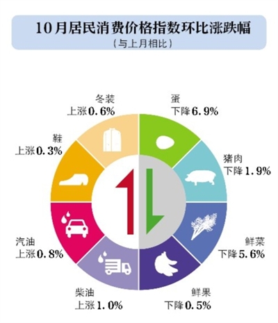 从环比看,10月份食品价格环比下降1%。余秋梅表示,食品价格下降主要是受鲜活食品价格下降较多的影响。食品中,蛋和猪肉价格环比分别下降了6.9%和1.9%。10月份鲜菜和鲜果价格分别出现下降。这些影响CPI环比下降0.32个百分点。