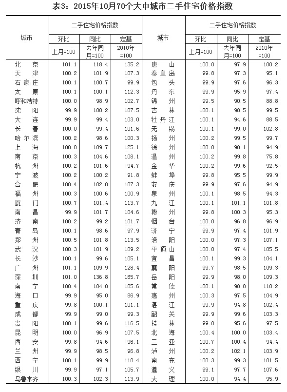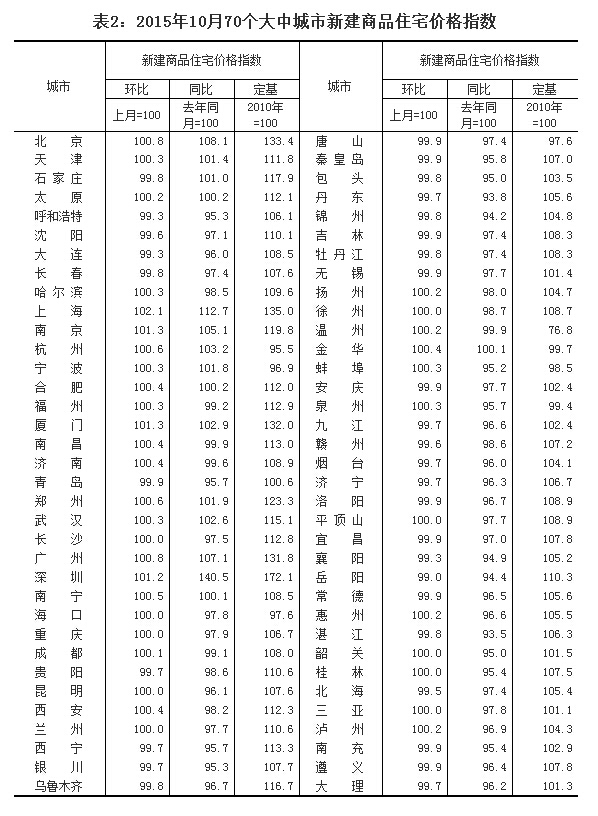 (二)与去年同月相比,70个大中城市中,价格下降的城市有54个,上涨的城市有16个。10月份,同比价格变动中,最高涨幅为40.5%,最低为下降6.5%。