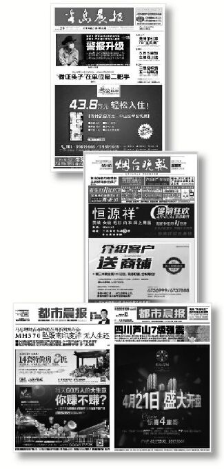 《烟台晚报》是烟台市的品牌,但该报11月6日的头版上,除了报头外所有内容竟全部被大小广告覆盖。与其隔海相望的大连都市报《半岛晨报》也不甘落后,头版半个版面都罗列着醒目的红色房地产广告。早些时候,徐州的《都市晨报》则在报道马航MH370新闻发布会和芦山地震等重大新闻事件的时候,头版上只有寥寥几行标题、导语,剩下大部分版面都留给了广告。如果挡住报头,会有人想到其真身是在当地享有盛誉的报纸头版,而不是街头飞落的宣传单页吗?何况,从视觉感受来看,重大灾难性新闻和大张旗鼓的广告放在一起多多少少有一种不严肃的感觉。