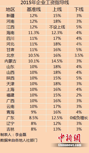 21省份2015年企业工资指导线。