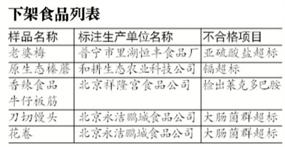 北京市食药监局昨日通报,5款食品及1款保健食品被检出不合格,现已全市下架。