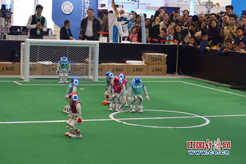 展览会上踢足球的机器人 中国经济网记者冯虎摄