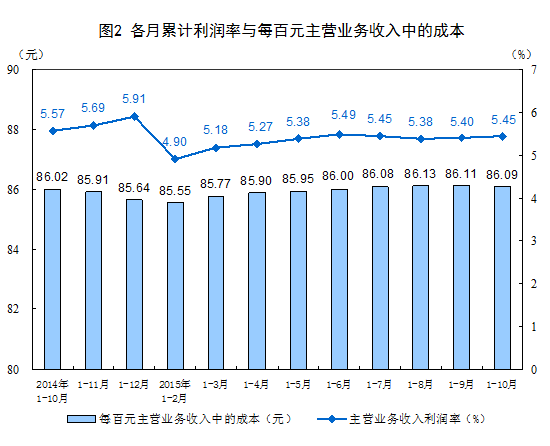 1-10月份,规模以上工业企业实现主营业务收入893727.9亿元,同比增长1%;发生主营业务成本769374.2亿元,增长1.1%。