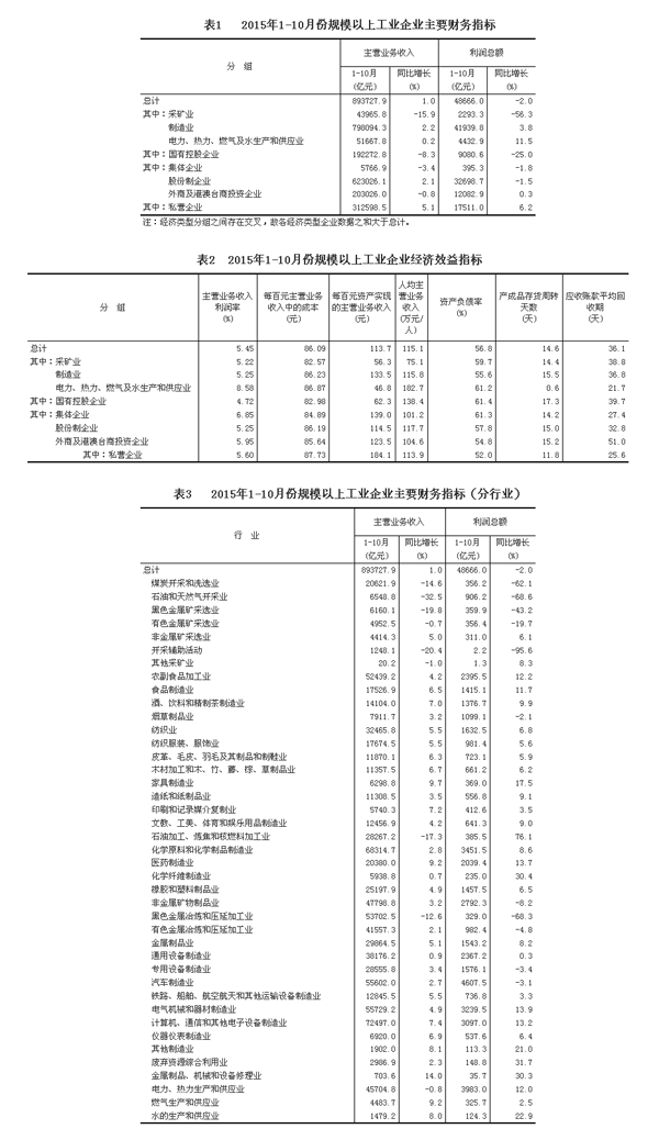 1-10月份,在41个工业大类行业中,30个行业利润总额同比增长,11个行业下降。主要行业利润增长情况:农副食品加工业利润总额同比增长12.2%,纺织业增长6.8%,石油加工、炼焦和核燃料加工业增长76.1%,化学原料和化学制品制造业增长8.6%,通用设备制造业增长0.3%,电气机械和器材制造业增长13.9%,计算机、通信和其他电子设备制造业增长13.2%,电力、热力生产和供应业增长12%,煤炭开采和洗选业下降62.1%,石油和天然气开采业下降68.6%,非金属矿物制品业下降8.2%,黑色金属冶炼和压延加工业下降68.3%,有色金属冶炼和压延加工业下降4.8%,专用设备制造业下降3.4%,汽车制造业下降3.1%。