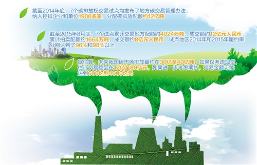 2013年6月18日,我国首个碳排放权交易平台在深圳启动,标志着中国碳市场建设迈出了关键性一步。此后,北京、天津、上海、广东、湖北、重庆等省市先后启动了碳排放权交易试点。截至2014年底,上述7个碳排放权交易试点均发布了地方碳交易管理办法,纳入控排企业和单位1900多家,分配碳排放配额约12亿吨。