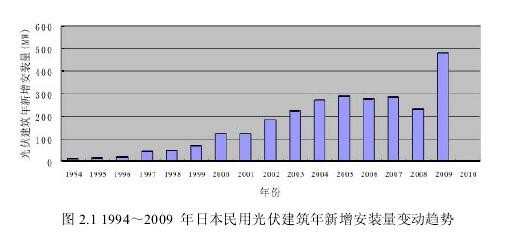 日本是典型的以政府直接补助为主要手段来激励国家光伏建筑产业的发展的国家。自1993年开始执行相关政策后,到1997年日本光伏建筑市场就超过了美国,此后的7年里日本一直是世界上光伏建筑市场占有量最大的国家。到2006年日本停止补贴政策,两年后推行了低碳社会行动计划,由图中数据可看出在此期间其发展速度相对放缓,09年又恢复光伏建筑补贴政策,对12万家庭光伏系统进行补贴,总额度为290亿元,该年光伏建筑光伏系统安装量增加了进5OOMW。