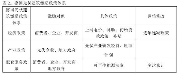德国政府出台的光伏建筑激励政策从1991年开始的光伏建筑统一固定上网电价,到2003年来的上网电价调整体系和初始投资贷款政策,再到2010年新增的光伏产业研发经费。德国政府逐渐建立了一套较为完整的光伏建筑激励体系,由经济政策、产业政策、配套服务政策等激励政策和政策调整体系组成,从而有效地激励了德国光伏产业的迅速发展。