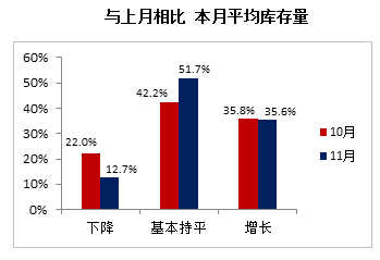 11月份,库存指数相比有所下降。认为库存量“增长”的比例从35.8%降至35.6%;“基本持平”的比例从42.2%升至51.7%;认为“下降”的比例从22.0%降至12.7%。