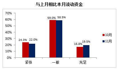 11月份,经销商流动资金状况比上月充足。认为流动资金“一般”的企业从59.0%降至58.5%;流动资金“充足”的比例从上月的16.8%升至19.5%;流动资金“紧张”的比例从上月的24.3%降至22.0%。