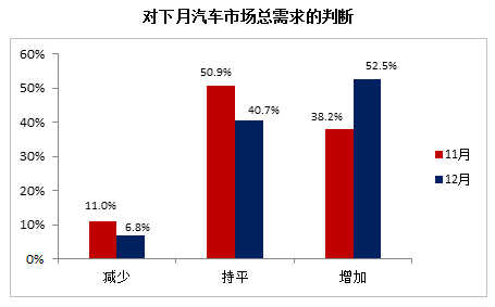 预计12月份市场需求与上月相比有所增加,认为市场需求“增加”的经销商比例由38.2%增至52.5%;认为市场需求“减少”的比例由11.0%降至6.8%。