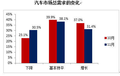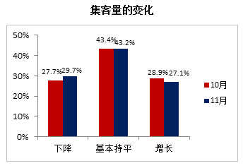 11月集客量相比上月有所下降,认为11月份集客量“下降”的经销商比例为由上月的27.7%升至29.7%;认为“增长”的比例由上月的28.9%降至27.1%。