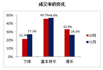 11月份,认为成交率“增长”比例由32.9%下降至26.3%;认为“下降”的比例由21.4%上升至27.1%;认为“基本持平”的比例由45.7%升至46.6%。
