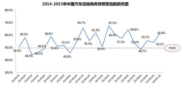 中国汽车流通协会发布的“中国汽车经销商库存预警指数调查”VIA(Vehicle Inventory AlertIndex)显示,2015年11月库存预警指数为61.8%,比上月上升了7.7个百分点。库存预警指数处于警戒线以上。