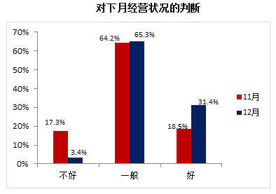 预计12月份经销商经营状况有所好转。调查显示,认为12月份经营状况“好”的比例由18.5%增至31.4%,认为“不好”的比例由17.6%降至3.4%。
