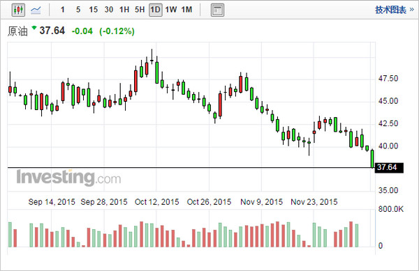 纽约商业交易所1月份交割的西德克萨斯中质油(WTI)合约跌2.32美元,或跌幅5.8%,结算于2009年2月来最低点每桶37.65美元,当地时间下午2:40,所有期货成交量较100日均量高出了63%。