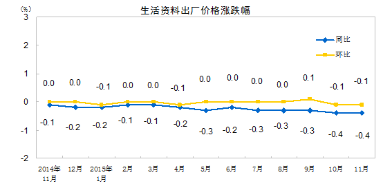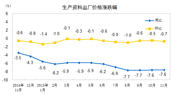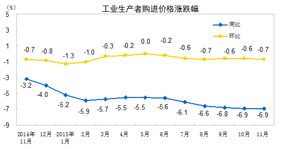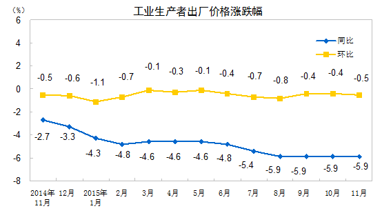 2015年11月份,全国工业生产者出厂价格环比下降0.5%,同比下降5.9%。工业生产者购进价格环比下降0.7%,同比下降6.9%。1-11月平均,工业生产者出厂价格同比下降5.2%,工业生产者购进价格同比下降6.0%。
