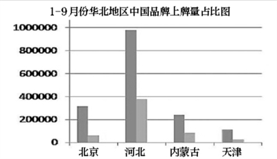 根据相关机构的统计,1-9月,中国品牌乘用车累计销售515.04万辆,同比增长21.2%,中国品牌市场份额提升至37.3%。从这一数据看,今年1-9月份,华北地区的四个汽车市场只有河北地区中国品牌销量超过平均水平,其余内蒙古、天津和北京,中国品牌销量占比不容乐观,似乎中国品牌在华北地区市场的销售堪忧!但是从北京市场单月上牌量表现来看,中国品牌销量变化并不明显,这表明主力中国品牌在一线城市已经开始站稳脚跟。