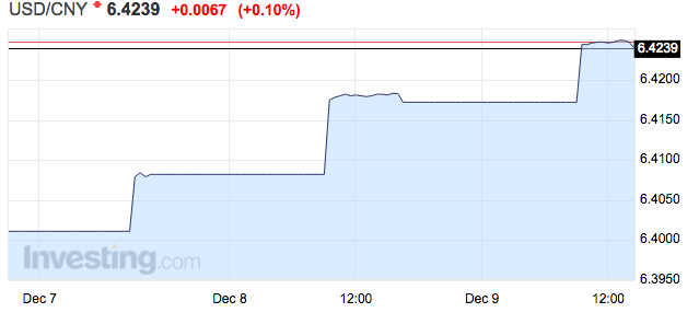 截至12月8日收盘,人民币对美元即期汇率报6.4172,继续下跌0.14%,上一交易日收于6.4082,盘中最低下探至6.4189;6.4172的收盘价格也成为2011年8月10日后(当天收报6.4181),人民币对美元即期汇率最低水平。