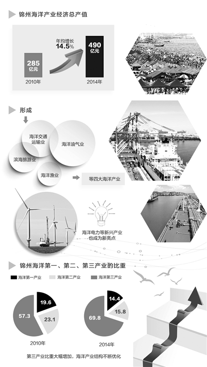 迅猛发展的海洋经济是近年来辽宁沿海经济带开发开放的一大亮点。近几年,辽宁省锦州市依托优越的区位条件和丰富的海洋资源,不断加大海洋经济建设力度,海洋经济呈现强劲发展态势。全市的海洋产业经济总产值从2010年285亿元增长到2014年的490亿元,年均增长14.5%。海洋经济成为锦州区域经济发展的新增长极。