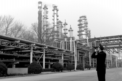 ▲12月7日,环保局工作人员在燕山石化查看停产减产情况。京华时报记者谭青摄