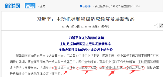 2014年12月14日,习近平总书记在江苏调研时首次提出“全面建成小康社会、全面深化改革、全面推进依法治国、全面从严治党”。