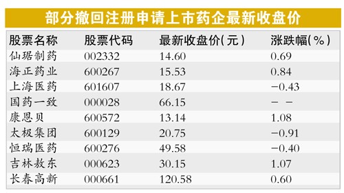 上月本报曾报道了康芝药业、华海药业等多家上市公司旗下产品注册申请不予批准的情况。而在国家食药监总局出重拳打击临床试验数据作假、颁布“史上最严药物临床试验数据自查令”后, 日前食药监总局公布了新一批的82家药企131个药品注册申请主动撤回。15日晚间,包括上海医药、复星医药、康恩贝、长春高新等在内的上市公司纷纷发公告撤回相关药品注册申请。