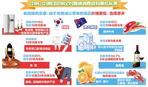 自贸协定的主要内容是关税减让,实施手段是原产地签证。这意味着,深受消费者欢迎的韩国化妆品、服饰等产品,澳大利亚乳制品、肉制品等,将逐步消减关税,市民购买更加方便,价格也更为亲民。