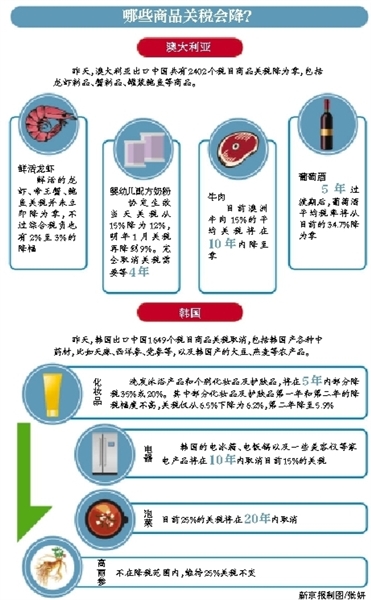 两个协定实施后将按照关税减让清单削减关税。其中,中韩自贸协定项下,6108个税号项下中国原产货物、1649个税号项下韩国原产货物将在对方立即享受零关税;中澳自贸协定项下,5662个税号项下中国原产货物、2402个税号项下澳大利亚原产货物将在对方立即享受零关税。