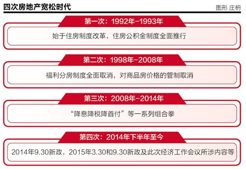 2014年下半年“9·30新政”出台,即被认为是第四次大宽松的开启。今年3月30日和9月30日,监管层连续发布松绑楼市的政策,预示着房地产政策环境不断向好。