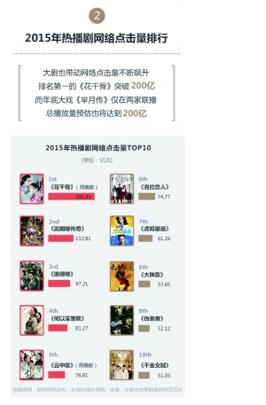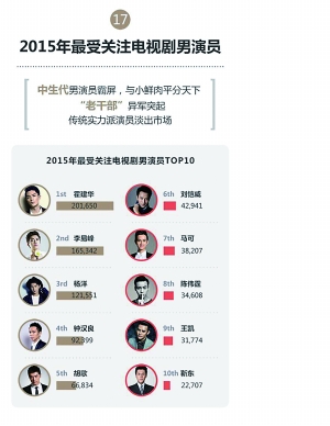 《花千骨》、《琅琊榜》、《伪装者》、《武媚娘传奇》、《何以笙箫默》等是霸占着“2015年热播剧网络点击量排行”、“这一年,讨论的话题里总有电视剧”、“2015热播剧平均收视TOP10”等榜单。不过正所谓高收视不等于好口碑,在“2015电视剧口碑TOP10”的排名中,依然能让人欣慰的是,《老农民》、《平凡的世界》、《刑警队长》、《嘿!老头》等彰显创作者情怀的好剧。在2015最受关注的演员评选中,男演员呈现中生代、小鲜肉和帅大叔三分天下的局面。霍建华、李易峰、杨洋排名前三,钟汉良、胡歌等紧随其后,而今年迅速蹿红、圈粉无数的王凯和靳东也入围前十。令人遗憾的是,传统的实力派男演员均榜上无名。女演员入围前十的都是借力作品,既有“劳模式”演员唐嫣、赵丽颖等,也有仅凭一部戏就稳坐榜单的范冰冰(《武媚娘传奇》)、赵薇(《虎妈猫爸》)、孙俪(《芈月传》)等。(冯遐)
