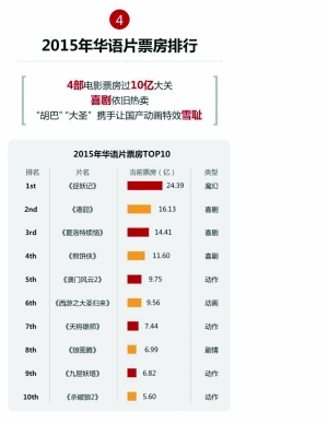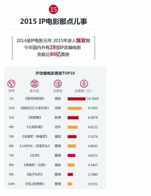 2015年中国电影全年票房突破400亿,国产片表现出色,全年共有4部突破10亿人民币大关,分别是《捉妖记》、《港囧》、《夏洛特烦恼》和《煎饼侠》。其中,《捉妖记》更是以24.39亿的成绩刷新票房纪录,将此前长期由进口片霸占的票房冠军宝座夺了回来。电影大卖也惠及演员,《捉妖记》的男女主角井柏然和白百何也凭借该片成为2015年度电影票房最高的男明星和女明星。根据《2015年腾讯娱乐白皮书》电影篇显示,2015年度票房排名前十的国产电影中,喜剧依然占了很大比例,而国产动画片的崛起则是意外之喜。《捉妖记》和《西游之大圣归来》两部动画叫好又叫座,让观众重拾对国产动画电影的信心。2015年也是IP电影集中上映的一年,全年共有28部IP改编电影上映,贡献了近80亿票房。然而,这些IP改编电影在吸引大批原著粉丝的同时,其创作水平良莠不齐,给“IP电影”的前景蒙上了一层阴影。除了《西游之大圣归来》之外,2015年卖座的IP改编电影如《夏洛特烦恼》、《九层妖塔》、《小时代4》、《何以笙箫默》、《奔跑吧!兄弟》等等,均成为这一特定时期的典型作品。(杨莲洁)