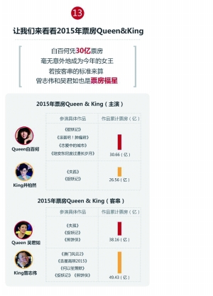 今年,中国电影票房突破400亿,单月票房赶超美国;高质量的“国产大剧”辈出,网络自制剧纷纷步入“10亿俱乐部”;综艺江湖的野心还在扩张,户外真人秀成为最大赢家;音乐演出市场通过在线演唱会悄然复苏,民谣歌手不再是小众;小鲜肉突出重围,占据半壁江山。值得一提的是,本年度娱乐白皮书首次发布90后娱乐行为调研,以6万余份有效样本为依托,重点分析了娱乐消费生力军90后的“娱乐观”。同时,《2015年腾讯娱乐白皮书》针对明星、电影、电视剧、综艺、音乐及90后各领域设置了明星榜单。黄晓明、白百何、李晨、王凯、好妹妹乐队、90后新势力欧豪以及董子健各自领取了该领域的“人气之星”称号。