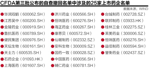 据21世纪经济报道记者不完全统计,仅在第三批公布的自查撤回名单中,累计已有25家上市药企上榜。