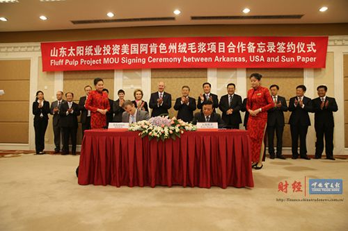 2015年11月20日,美国阿肯色州经济发展委员会与山东太阳纸业股份有限公司在济南签署绒毛浆13.6亿美元投资项目合作备忘录。这是迄今为止中国民企赴美最大的制造业绿地投资项目。山东省商务厅厅长畲春明表示,太阳纸业在“走出去”把中国短缺的资源“引进来”的同时,也将推动民族品牌得到国际化发展,提升山东企业在美国以及世界市场的影响力。对美方来言,该项目符合重振美国制造业和出口倍增计划,可以拉动当地经济增长,提供400个就业岗位,增加当地政府财税收入。