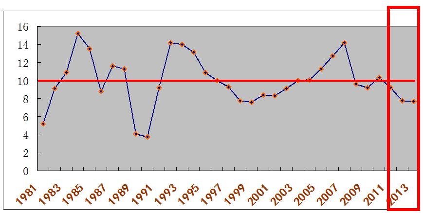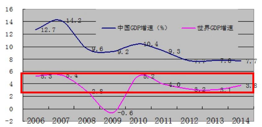习近平总书记提出的“新常态”重大战略研判源自,我国正处在“三期叠加”的特殊阶段。我国经济增长速度从2012年开始结束近20年10%的高速增长,转而进入增速换档期。根据国家统计局的数据显示,2012年我国的经济增长率为7.8%;2013年我国的经济增长率为7.7%;2014年我国的经济增长率为7.4%。根据2015年《政府工作报告》:2015年预期我国国内生产总值增长7.0%左右。