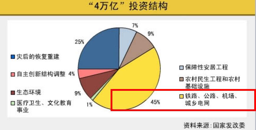 目前我国正在经历结构调整的镇痛期,2012年底,我国钢铁、水泥、电解铝、平板玻璃、船舶产能利用率分别仅为72%、73.7%、71.9%、73.1%和75%,明显低于国际通常水平。而在经济下行压力增大的情况下,政府出台的4万亿投资结构中,45%是铁路、公路、机场、城乡电网的投资,使得目前我国仍处于前期刺激政策消化期。