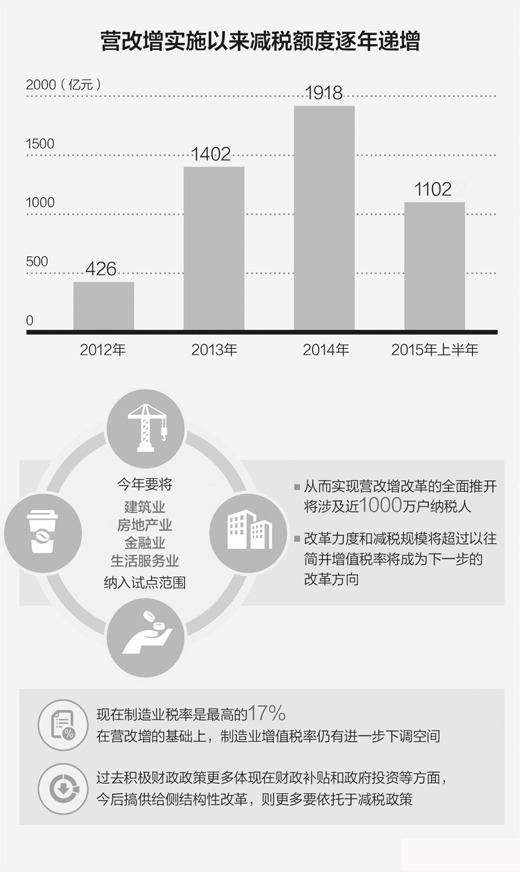 从以往经验看,营改增每推进到一个重要行业,都会带来减税规模的大幅增加。截至2015年上半年,营改增已累计减税4848亿元,其中2012年减426亿元,2013年减1402亿元,2014年减1918亿元,2015年上半年减1102亿元。即将推行营改增的建筑、房地产和金融三个行业与大部分产业关系密切,很多企业都会有厂房、金融方面的成本支出,营改增全面推开后,这些行业的增值税发票将给大部分企业增加进项抵扣额。