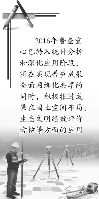 据国家测绘地理信息局相关负责人介绍,2016年普查重心已转入统计分析和深化应用阶段。实现普查成果全面网络化共享的同时,积极推进成果在国土空间布局、农业现代化建设、自然资源资产管理和保护、生态文明绩效评价考核、服务保障民生等方面的应用。
