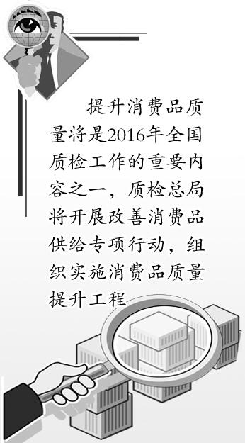 支树平表示,提升消费品质量将是2016年全国质检工作的重要内容之一。质检总局将开展改善消费品供给专项行动,组织实施消费品质量提升工程,全国质检系统将消费品质量作为工作重点,从全国范围内,突出空气净化器、电饭煲、智能马桶盖、智能手机、儿童纸尿裤、儿童玩具、婴幼儿童装、厨具、床上用品、家具等和消费者关系密切的10种消费品。质检系统还将实施“互联网+质检”行动,从而为加强供给侧结构性改革,提高供给体系质量和效率提供有力支撑。