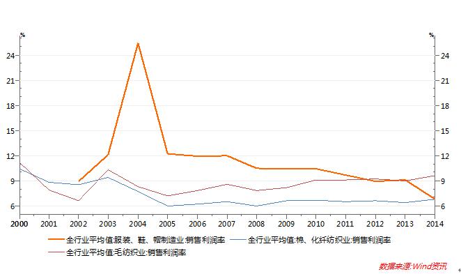 人民币汇率升值与人工成本上升,导致行业利润率逐年下降。以服装行业为例,自2005年以来,行业销售利率润逐年下滑。毛纺织行业以及棉纺织业虽然利润总体逐步趋于稳定,但是难以恢复往日光彩。