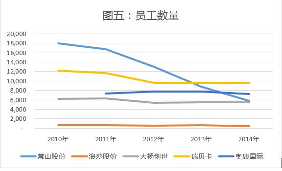 行业变动带来的一个直接结果就是就业。以国内行业领先的上市公司,常山股份(000158.SZ)、浪莎股份(600137.SH)等为例,其员工数量自2010年以来呈现普遍的下降趋势。虽然,这样的变动趋势包含着机器替代人工的成分,但是从整体行业来看,不少中低端企业难以克服人工成本上升以及汇率升值的负面影响。