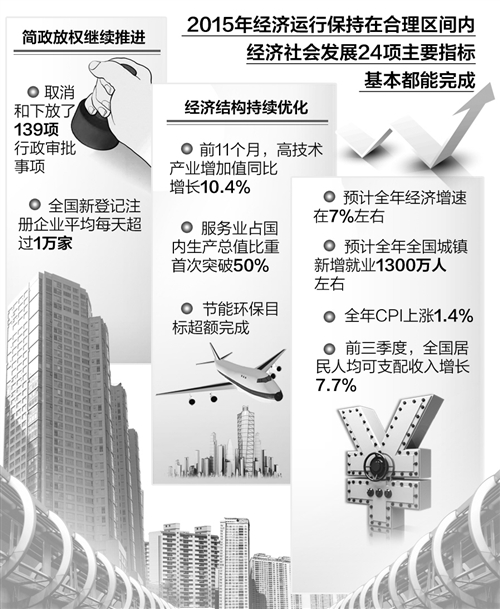 “我国采取了有力有效的定向调控、相机调控,经济运行保持在合理区间内。”李朴民表示,预计2015年经济增速在7%左右,与预期目标基本一致;前11个月全国城镇新增就业1251万人,预计全年新增1300万人左右;物价涨幅平稳,全年CPI上涨1.4%;前三季度,全国居民人均可支配收入增长7.7%,持续快于经济增速。