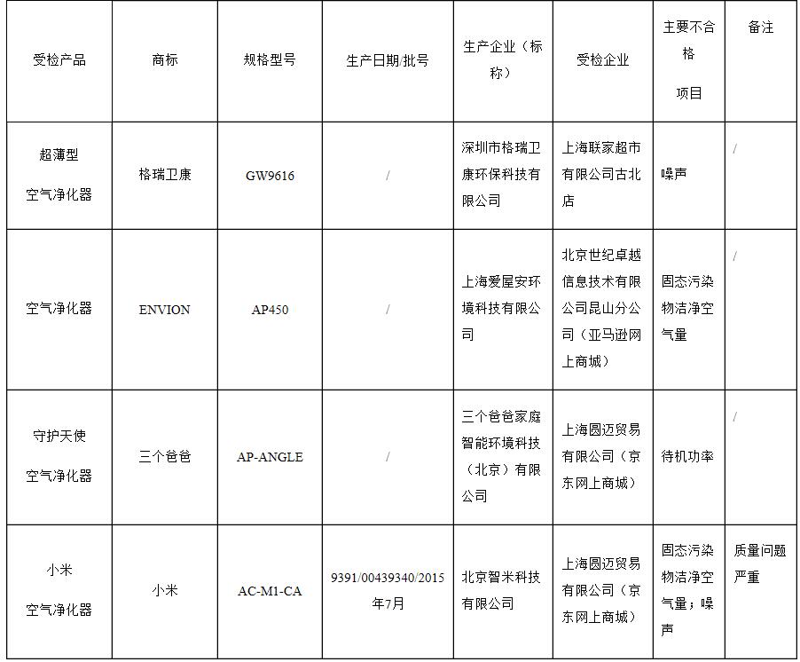 北京1月14日讯 近期,上海市质量技术监督局对本市生产和销售(含网络销售)的空气净化器产品质量进行了专项监督抽查,本次抽查了36批次产品。经检验,小米空气净化器、格瑞卫康超薄型空气净化器、ENVION空气净化器、三个爸爸守护天使空气净化器四批次产品不合格。