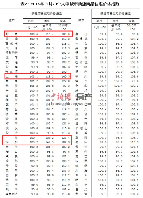 1月18日电 今日,来自国家统计局的数据显示,2015年12月份,70城市住宅销售价格环比继续上涨,最高涨幅为深圳的3.2%,最低下降为丹东的0.9%。尤其值得关注的是,深圳在环比上涨的同时,同比房价继续领涨,去年12月份房价同比上涨47.5%,远远超出北京、上海等一线城市的上涨水平。