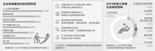 融资难度大,成本高,并不是个别企业的感受。中国中小企业发展促进中心最近发布的《2015年全国企业负担调查评价报告》显示,人工成本快速攀升、融资难且贵、生产要素价格上涨等是企业面临的主要困难,66%的企业反映“融资成本高”,比例较上年提高了6个百分点;66%的企业反映“资金压力紧张”,比例与上年基本持平。
