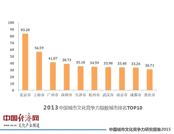 北京1月19日讯(记者 成琪) 文化是城市的灵魂,城市的文化竞争力已经成为城市发展中的重要因素,与城市发展的未来息息相关。1月18日,由中国传媒大学文化发展研究院主办的《中国城市文化竞争力研究报告(2015)》发布会上,“中国城市文化竞争力指数”排名首次发布。《研究报告》共涉及了36个城市,主要是直辖市、省会城市、副省会城市和计划单列市。他们在文化竞争力方面差异显著 。从综合排名上看,北京、上海、广州、深圳、天津、杭州、武汉、南京、成都、重庆十座城市的城市文化竞争力综合得分位于前列,其中被人们称之为”帝都“和”魔都“的北京和上海不仅仅在经济实力上领先,其文化优势也明显居于前列,远远高于紧随其后的深圳河广州。