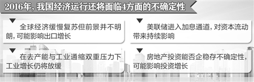 连平表示,2016年,我国经济运行还将面临着4个方面的不确定性。一是全球经济缓慢复苏但前景并不明朗,可能影响出口增长。二是美联储进入加息通道,对资本流动带来持续影响。三是在去产能与工业通缩双重压力下工业增长仍将放缓。四是房地产投资能否企稳存在不确定性,可能影响投资增长。
