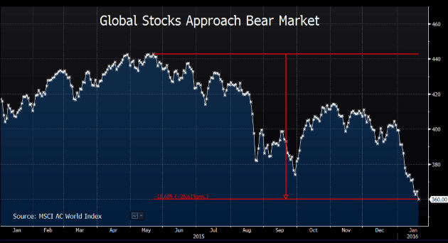 纽约时间上午9:31,MSCI世界股票指数跌2%,较5月份高点的跌幅扩大到19%,距离20%的熊市门槛只有一步之遥,这期间全球股市市值损失超过15万亿美元。