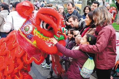 要了解、融入西班牙主流社会,华侨华人敞开怀抱、积极沟通是“尚方宝剑”。图为在西班牙举行的春节庆祝活动中,巴塞罗那当地居民与舞狮队成员在游行中互动。新华社发