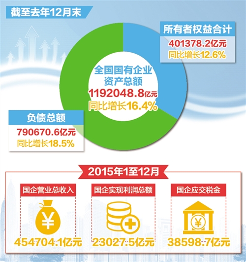 数据显示,全国国企家底已超过40万亿元。截至去年12月末,全国国有企业资产总额1192048.8亿元,同比增长16.4%;负债总额790670.6亿元,同比增长18.5%;所有者权益合计401378.2亿元,同比增长12.6%。